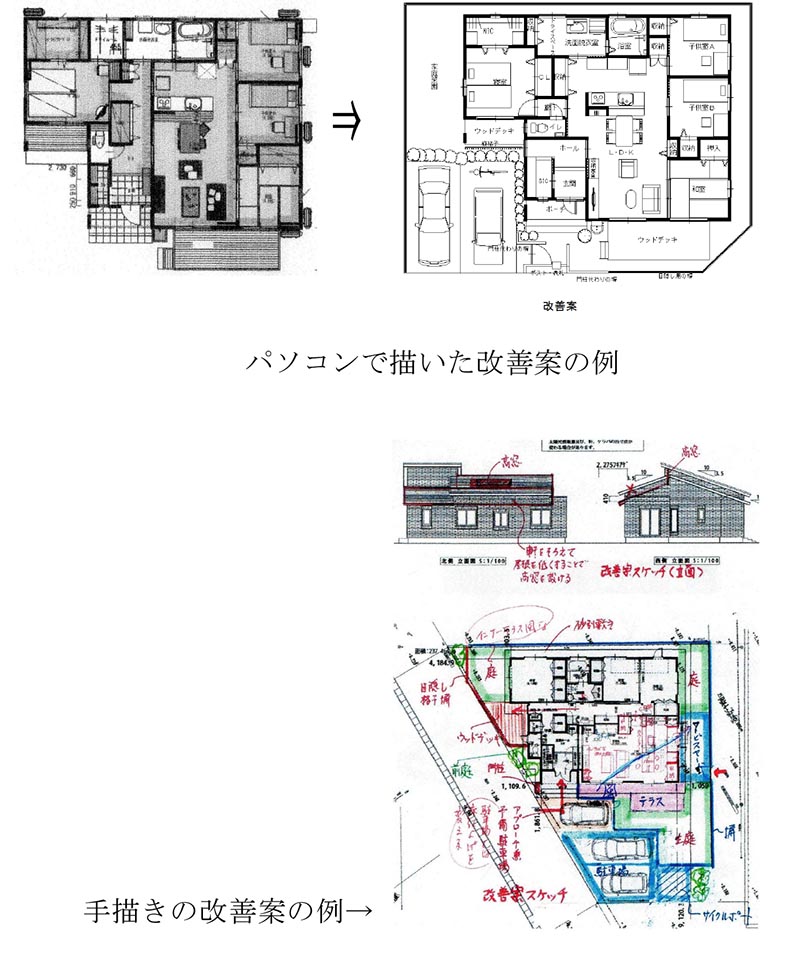 お客様が今、検討中の図面を弊社にお送りいただければ、間取り作成の基本事項(住宅計画基礎知識)に基づき診断し、レポートにまとめてご報告します。その際、プランの良いところ、悪いところを具体的に分かりやすく提示し、改善の方向性までご提案します。