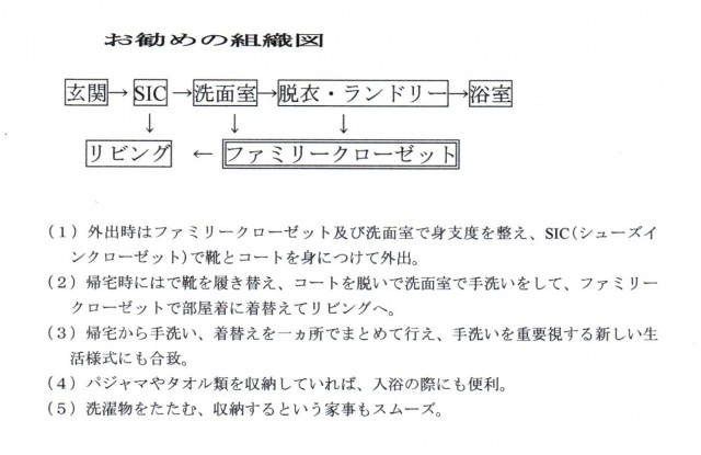 家族が帰宅したときの更衣の仕方を考えておくことは大切だと思います。特に、2階建て住宅の場合、日常的にわざわざ2階に上がって更衣することにはならないと思います。子どもさんが小さい間は特にそのようなスペースが必要になります。そのような意味で、1階にファミリークローゼットがあると便利です。