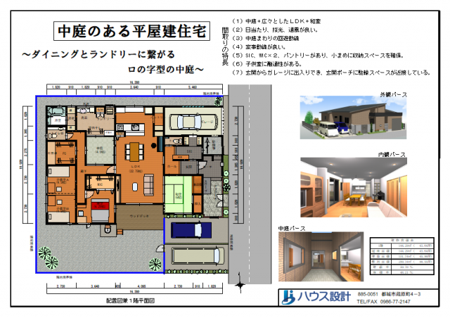- 新築の間取り 一戸建て 住宅設計プラン(60)~中庭のある平屋建住宅~